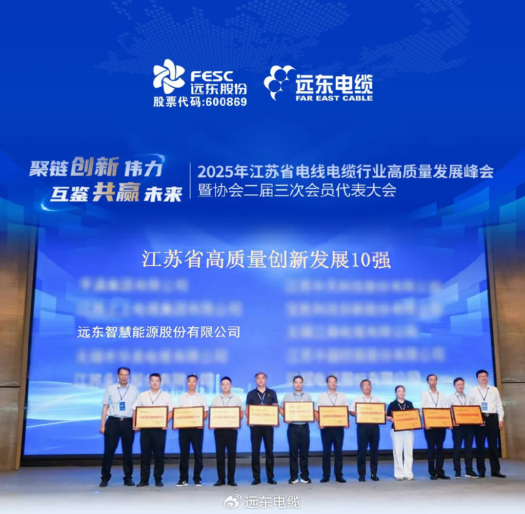 遠東智慧能源股份有限公司(簡稱:遠東股份 股票代碼:600869)憑借卓越的產品品質、強大的創(chuàng)新力以及持續(xù)的市場競爭優(yōu)勢,成功入選“2024年度江蘇線纜產業(yè)高質量創(chuàng)新發(fā)展企業(yè)10強”。